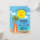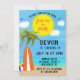 Celebrate your special day with our fun in the sun beach birthday party invitation! This vibrant design showcases a sunny beach scene with a palm tree and surf board, creating the perfect setting for a summer celebration. Your party details are elegantly displayed in modern typography, making it easy for guests to save the date and join in on the fun. Let's make your birthday party unforgettable with this sunny and cheerful invitation!