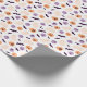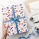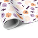 This design features a playful and colourful Halloween pattern with a minimalist design. The pattern includes simple, rounded shapes of jack-o'-lanterns, ghosts, skulls, and bats, all scattered across a white background. The colour palette is soft yet vibrant, with pumpkins in shades of orange, ghosts in pale peach, skulls in lavender, and bats in deep purple. Each element has a cute and friendly expression, making the pattern fun and lighthearted, perfect for Halloween decorations or kids' party themes. The overall design is cheerful and festive, capturing the whimsical side of Halloween.