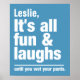 "It's all fun & laughs until you wet your pants". Change the text field to what you want. You can also change the font and its size and colour by using the "Customise it" function, as well as add more text fields if you wish. Further, you can change the background colour of this item to whatever colour you want. See my store for more items with this design.