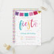 Cute Mexican theme kids' birthday party invitation. Featuring "fiesta" in a modern script typeface in vibrant summer colours. Your details appear in a simple typography with triangle confetti around it with a bunting at the top. This birthday invite reverses to a funky geometric pattern.
