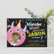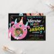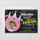 Fun, bold and bright monster mash themed birthday party invitation design. The design features a cute and fun monster character, which you can place your own photo in behind for a personalised unique look. A dark black background mades the colourful monster character and design elements pop. The whimsical design of the character has been applied to the layout of the invitation design and fonts to create a bold, fun birthday invitation with personality and style. The reverse side of the invitation several different colourful monsters arranged around the card to look like they're peeking from the sides of the card. All illustrations contained in this fun, colourful monster mash photo birthday party celebration invitation are hand-drawn original artwork by Moodthology. You can customise the text size, text colour, font and layout for your own personal design preference.