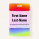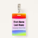 This badge design features a fun, rainbow-like multicolored gradient pattern featuring various shades of colours like yellow, orange, red, pink, purple, blue and green. It also features a custom name in black coloured text within a white light area. There is also a custom message under the name that could show information such as a job role name, or a profession, or a business/company name. [~Z0000176]
