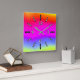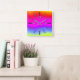 This square clock design features a fun, rainbow-like multicolored gradient pattern featuring various shades of colours like yellow, orange, red, pink, purple, blue and green. It also features rectangles marking the hours, and numbers indicating the hours "12", "3", "6", and "9".