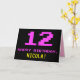 The front of this fun, nerdy, and geeky birthday themed greeting card design features a large pink number "12", along with the message "HAPPY BIRTHDAY," in pink, and a bold yellow editable recipient name. The text features a look inspired by that of classic 8-bit style computer game and video game graphics from the 1970s and 1980s, and the background is colored black. The inside has a customizable birthday greeting message, or could perhaps be cleared and left blank if a message is to be written by hand instead. A silly customizable birthday card like this might be a fun way of acknowledging somebody’s twelfth birthday. [~Z0000478]