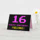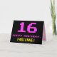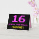 The front of this fun, geeky, and nerdy birthday greeting card design features a large number "16" and the message "HAPPY BIRTHDAY," colored pink, along with a bold yellow customizable recipient name. The text has an appearance inspired by that of vintage 8-bit style computer/video game graphics from the 1970s and 1980s, and the background is colored black. The inside has a customized birthday greeting message, or could perhaps be cleared and left blank if a message is to be written by hand instead. A silly personalized birthday card like this might be a fun way to celebrate somebody’s sixteenth birthday. [~Z0000478]