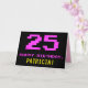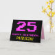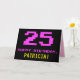 The front of this fun, nerdy, and geeky birthday-themed greeting card design features a large number "25" and the message "HAPPY BIRTHDAY," coloured pink, along with a bold yellow custom recipient name. The text has a look inspired by that of classic 8-bit style video/computer game graphics from the 1970s and 1980s, and the background is coloured black. The inside features a customisable birthday greeting message, or could perhaps be cleared and left blank if a message is to be written by hand instead. A silly personalised birthday card like this might be a fun way to acknowledge somebody’s twenty fifth birthday. [~Z0000478]