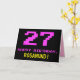 The front of this fun, nerdy, and geeky birthday themed greeting card design features a large number "27" and the message "HAPPY BIRTHDAY," coloured pink, along with a bold yellow customisable recipient name. The text features a look inspired by that of vintage 8-bit style video game and computer game graphics from the 1970s and 1980s, and the background is coloured black. The inside has a customised birthday greeting message, or could perhaps be cleared and left blank if a message is to be written by hand instead. A silly customisable birthday card like this might be a fun way of celebrating somebody’s twenty seventh birthday. [~Z0000478]