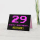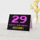 The front of this fun, nerdy, and geeky birthday greeting card design features a large pink number "29", along with the message "HAPPY BIRTHDAY," in pink, and a bold yellow editable recipient name. The text features a look inspired by that of vintage 8-bit style video/computer game graphics from the 1970s and 1980s, and the background is colored black. The inside has a personalized birthday greeting message, or could perhaps be cleared and left blank if a message is to be written by hand instead. A silly personalized birthday card like this might be a fun way to celebrate somebody’s twenty ninth birthday. [~Z0000478]