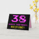 The front of this fun, geeky, and nerdy birthday themed greeting card design features a large number "38" and the message "HAPPY BIRTHDAY," colored pink, along with a bold yellow editable recipient name. The text features a look inspired by that of retro 8-bit style video/computer game graphics from the 1970s and 1980s, and the background is colored black. The inside features a customized birthday greeting message, or could perhaps be cleared and left blank if a message is to be written by hand instead. A silly personalized birthday card like this might be a fun way to acknowledge somebody’s thirty eighth birthday. [~Z0000478]