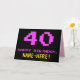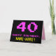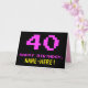 The front of this fun, nerdy, and geeky birthday-themed greeting card design features a large number "40" and the message "HAPPY BIRTHDAY," coloured pink, along with a bold yellow customisable recipient name. The text features an appearance inspired by that of classic 8-bit style video/computer game graphics from the 1970s and 1980s, and the background is coloured black. The inside features a personalised birthday greeting message, or could perhaps be cleared and left blank if a message is to be written by hand instead. A silly customisable birthday card like this might be a fun way to acknowledge somebody’s fortieth birthday. [~Z0000478]