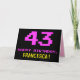 The front of this fun, nerdy, and geeky birthday-themed greeting card design features a large number "43" and the message "HAPPY BIRTHDAY," coloured pink, along with a bold yellow customisable recipient name. The text has a look inspired by that of retro 8-bit style computer/video game graphics from the 1970s and 1980s, and the background is coloured black. The inside features a customisable birthday greeting message, or could perhaps be cleared and left blank if a message is to be written by hand instead. A silly customisable birthday card like this might be a fun way to send a message celebrating somebody’s forty third birthday. [~Z0000478]