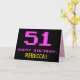 The front of this fun, geeky, and nerdy birthday greeting card design features a large pink number "51", along with the message "HAPPY BIRTHDAY," in pink, and a bold yellow editable recipient name. The text has an appearance inspired by that of vintage 8-bit style video game and computer game graphics from the 1970s and 1980s, and the background is colored black. The inside features a customizable birthday greeting message, or could perhaps be cleared and left blank if a message is to be written by hand instead. A silly personalized birthday card like this might be a fun way to celebrate somebody’s fifty first birthday. [~Z0000478]