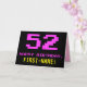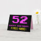 The front of this fun, nerdy, and geeky birthday greeting card design features a large number "52" and the message "HAPPY BIRTHDAY," coloured pink, along with a bold yellow personalised recipient name. The text has a look inspired by that of vintage 8-bit style video/computer game graphics from the 1970s and 1980s, and the background is coloured black. The inside has a custom birthday greeting message, or could perhaps be cleared and left blank if a message is to be written by hand instead. A silly customisable birthday card like this might be a fun way to acknowledge somebody’s fifty second birthday. [~Z0000478]