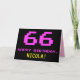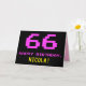 The front of this fun, geeky, and nerdy birthday greeting card design features a large number "66" and the message "HAPPY BIRTHDAY," colored pink, along with a bold yellow custom recipient name. The text has an appearance inspired by that of vintage 8-bit style computer/video game graphics from the 1970s and 1980s, and the background is colored black. The inside has a customizable birthday greeting message, or could perhaps be cleared and left blank if a message is to be written by hand instead. A silly personalized birthday card like this might be a fun way to celebrate somebody’s sixty sixth birthday. [~Z0000478]