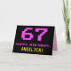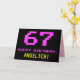 The front of this fun, geeky, and nerdy birthday-themed greeting card design features a large number "67" and the message "HAPPY BIRTHDAY," coloured pink, along with a bold yellow editable recipient name. The text has an appearance inspired by that of vintage 8-bit style video/computer game graphics from the 1970s and 1980s, and the background is coloured black. The inside features an editable birthday greeting message, or could perhaps be cleared and left blank if a message is to be written by hand instead. A silly customisable birthday card like this might be a fun way of celebrating somebody’s sixty seventh birthday. [~Z0000478]