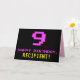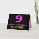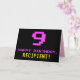 The front of this fun, geeky, and nerdy birthday greeting card design features a large pink number "9", along with the message "HAPPY BIRTHDAY," in pink, and a bold yellow customizable recipient name. The text has an appearance inspired by that of classic 8-bit style computer/video game graphics from the 1970s and 1980s, and the background is colored black. The inside has a personalized birthday greeting message, or could perhaps be cleared and left blank if a message is to be written by hand instead. A silly customizable birthday card like this might be a fun way of acknowledging somebody’s ninth birthday. [~Z0000478]