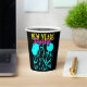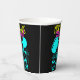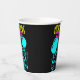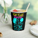 Fun New Years Eve party custom paper cups with neon colours and black background template design. Festive celebration illustration with champagne flutes, balloons, music notes and confetti. Customisable design. Retro neon pink yellow and turquoise letters.