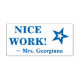 This encouraging rubber stamp design features the message "NICE WORK!" and a customised teacher's name. It also features a decorative star shape. It could be used by a teacher or educator when marking assignments, to acknowledge that the student has done well.
