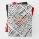 The main design is a collage of the word Uffda using various fonts in black text on white with a larger red text in the centre. The other two papers are a coordinated red & white stripe and black with white polka dots.
