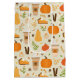 This design showcases a delightful fall-themed pattern filled with cosy autumn elements. The design includes illustrations of pumpkins, slices of pumpkin pie topped with whipped cream, warm fall beverages in to-go cups, and butternut squash. Scattered among these are cinnamon sticks, star anise, sprigs of greenery, autumn leaves, acorns, and small berries, all set against a soft cream background. The pattern exudes a warm and inviting atmosphere, perfect for celebrating the flavours and colours of the autumn season.