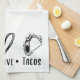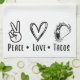 Our custom kitchen towel adorned with quote Peace Love Tacos. View our full line of products in our Zazzle store.