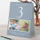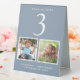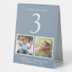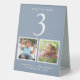 Fun dusty blue wedding reception table number tent signs. Each table number corresponds to a photo of the bride and groom at the same age (for example, for Table 10, personalise the table number with "10" and add photos of the bride and groom when they were 10). If you have a large number of tables, you can divide them in half and have the first half with one background colour and the second half with a different background colour.