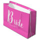 Fun pink Bride large gift bag. Casual script text in white on a bright pink background with wedding date in classic block text. The wedding date can be removed by clearing the text field, or changed to add bride and groom initials.