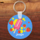 A keychain with a summery theme. Designed with pink popsicle and some red strawberries tumbling around the popsicle along with some yellow paint splashes. Blue background. Personalise with a name.