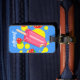 A personalised luggage tag with a summery theme. Designed with pink popsicle and some red strawberries tumbling around the popsicle along with some yellow paint splashes. Blue background.