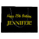 One side of this fun and simple birthday-themed giftbag design features a large number "15" with a dark pink and light pink stripes pattern. The birthday greeting message "Happy 15th Birthday," and a personalised name appear on the other side, both in yellow coloured text. The background has a black colouring. Gift bags like this might be used when wrapping presents or gifts being given to somebody who is celebrating their fifteenth birthday. [~Z0000378]