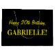 One side of this fun and simple birthday-themed gift bag design has a large number "20" featuring a dark pink and light pink stripes pattern. The birthday greeting message "Happy 20th Birthday," and a personalised name appear on the other side, both in yellow coloured text. The background has a black colouring. Gift bags like this might be used when wrapping presents or gifts being given to somebody who is celebrating their twentieth birthday. [~Z0000378]