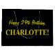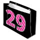 One side of this fun and simple birthday-themed giftbag design features a large number "29" with a dark pink and light pink stripes pattern. The other side has the birthday greeting message "Happy 29th Birthday," and a custom name, both in yellow coloured text. The background has a black colouring. A gift bag like this might be used when wrapping gifts or presents being given to celebrate somebody’s twenty ninth birthday. [~Z0000378]