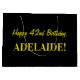 One side of this simple and fun birthday-themed gift bag design has a large number "42" featuring a dark pink and light pink stripes pattern. The birthday greeting message "Happy 42nd Birthday," and a customisable name appear on the other side, both in yellow coloured text. The background has a black colouring. A gift bag like this might be used when wrapping presents or gifts being given to somebody who is celebrating their forty second birthday. [~Z0000378]