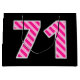 One side of this fun and simple birthday-themed giftbag design features a large number "71" with a dark pink and light pink stripes pattern. The birthday greeting message "Happy 71st Birthday," and a personalised name appear on the other side, both in yellow coloured text. The background is coloured black. A gift bag like this might be used when wrapping presents or gifts being given to somebody who is celebrating their seventy first birthday. [~Z0000378]