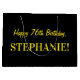 One side of this simple and fun birthday-themed giftbag design features a large number "76" with a dark pink and light pink stripes pattern. The other side features the birthday greeting message "Happy 76th Birthday," and a custom name, both in yellow coloured text. The background is coloured black. A gift bag like this might be used when wrapping presents or gifts being given to somebody who is celebrating their seventy sixth birthday. [~Z0000378]
