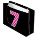 One side of this fun and simple birthday-themed giftbag design features a large number "7" with a dark pink and light pink stripes pattern. The other side features the birthday greeting message "Happy 7th Birthday," and a customisable name, both in yellow coloured text. The background has a black colouring. A gift bag like this might be used when wrapping gifts or presents being given to celebrate somebody’s seventh birthday. [~Z0000378]