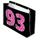 One side of this fun and simple birthday-themed giftbag design has a large number "93" featuring a dark pink and light pink stripes pattern. The birthday greeting message "Happy 93rd Birthday," and a customisable name appear on the other side, both in yellow coloured text. The background is coloured black. Gift bags like this might be used when wrapping gifts or presents being given to somebody who is celebrating their ninety third birthday. [~Z0000378]