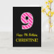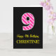 The front of this simple and fun birthday-themed greeting card design features a large number "9" with a light pink and dark pink stripes pattern, along with the message "Happy 9th Birthday,", and an editable name. The background of the front is coloured black. The inside features a customised birthday greeting message, or could perhaps be cleared and left blank if a message is to be written by hand instead. A personalised birthday card like this might be a fun way to acknowledge somebody’s ninth birthday. [~Z0000377]
