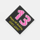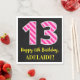 This fun birthday-themed paper napkin design features a large number "13", with a dark pink and light pink stripes pattern. It also features the message "Happy 13th Birthday,", and a personalised name. The background is coloured black. Fun, customisable paper napkins like this might be used at a birthday party being held to celebrate somebody’s thirteenth birthday. [~Z0000380]