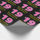 This fun birthday-themed wrapping paper design features a large number "19" with a light pink and dark pink stripes pattern, along with the message "Happy 19th Birthday,", and a custom name. The background is coloured black. Wrapping paper like this might be used when wrapping gifts being given to somebody in celebration of their nineteenth birthday. [~Z0000376]