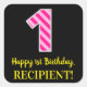 Fun Pink Stripes “1”: Happy 1st Birthday + Name Square Sticker