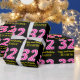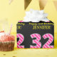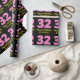 This fun birthday-themed wrapping paper design features a large number "32", with a dark pink and light pink stripes pattern. It also features the message "Happy 32nd Birthday,", and an editable name. The background is coloured black. Birthday themed wrapping paper like this might be used when giving a gift or present in celebration of somebody’s thirty second birthday. [~Z0000376]
