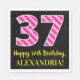 This fun birthday-themed paper napkin design features a large number "37", with a light pink and dark pink stripes pattern. It also features the message "Happy 37th Birthday,", and an editable name. The background is coloured black. Fun, customisable paper napkins like this might be used at a celebration being held to honour somebody’s 37th birthday. [~Z0000380]