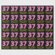 This fun birthday-themed wrapping paper design features a large number "37", with a light pink and dark pink stripes pattern. It also features the message "Happy 37th Birthday,", and a personalised name. The background is coloured black. Wrapping paper like this might be used when wrapping gifts being given to somebody in celebration of their thirty seventh birthday. [~Z0000376]