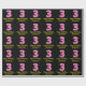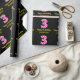 This fun birthday-themed wrapping paper design features a large number "3" with a dark pink and light pink stripes pattern, along with the message "Happy 3rd Birthday,", and a custom name. The background is coloured black. Wrapping paper like this might be used when giving a gift or present in honour of somebody’s third birthday. [~Z0000376]