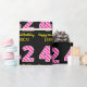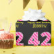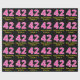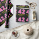 This fun birthday-themed wrapping paper design features a large number "42" with a dark pink and light pink stripes pattern, along with the message "Happy 42nd Birthday,", and an editable name. The background is coloured black. Wrapping paper like this might be used when wrapping gifts being given to somebody in celebration of their forty second birthday. [~Z0000376]