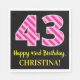 This fun birthday-themed paper napkin design features a large number "43" with a dark pink and light pink stripes pattern, along with the message "Happy 43rd Birthday,", and a customisable name. The background is coloured black. Birthday themed paper napkins like this might be used at a party celebrating somebody’s forty third birthday. [~Z0000380]