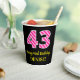 This joyful birthday-themed square sticker design features a large number “43”, with a light pink and dark pink stripes pattern. It also features the message “Happy 43rd Birthday,”, and a customisable name. The background is coloured black. Paper cups like this might be used at a birthday party held in celebration of somebody’s 43rd birthday. [~Z0000580]