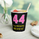 This cheerful birthday-themed square sticker design features a large number “44” with a light pink and dark pink stripes pattern, along with the message “Happy 44th Birthday,”, plus a custom name. The background is coloured black. Birthday themed paper cups like this might be fun to use at a birthday party being held for somebody who is celebrating their 44th birthday. [~Z0000580]