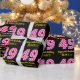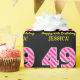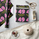 This fun birthday-themed wrapping paper design features a large number "49" with a dark pink and light pink stripes pattern, along with the message "Happy 49th Birthday,", and a personalised name. The background is coloured black. Wrapping paper like this might be used when wrapping gifts being given to somebody in celebration of their forty ninth birthday. [~Z0000376]